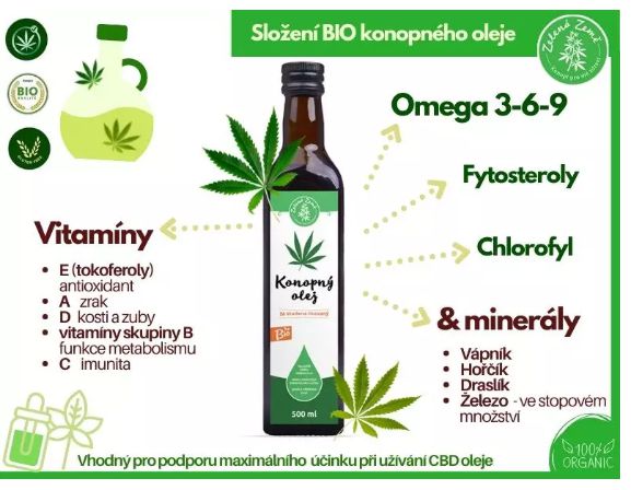 BIO konopný olej prémiovej kvality sa získava za studena lisovaných konopných semienok. Je považovaný za najvhodnejší rastlinný olej av mnohých veciach prekoná aj olivový olej. Ide o produkt ekologického poľnohospodárstva CZ-BIO-002. Tento olej získal od návštevníkov festivalu konope (Cannafest 2016) cenu Najlepší konopný olej.